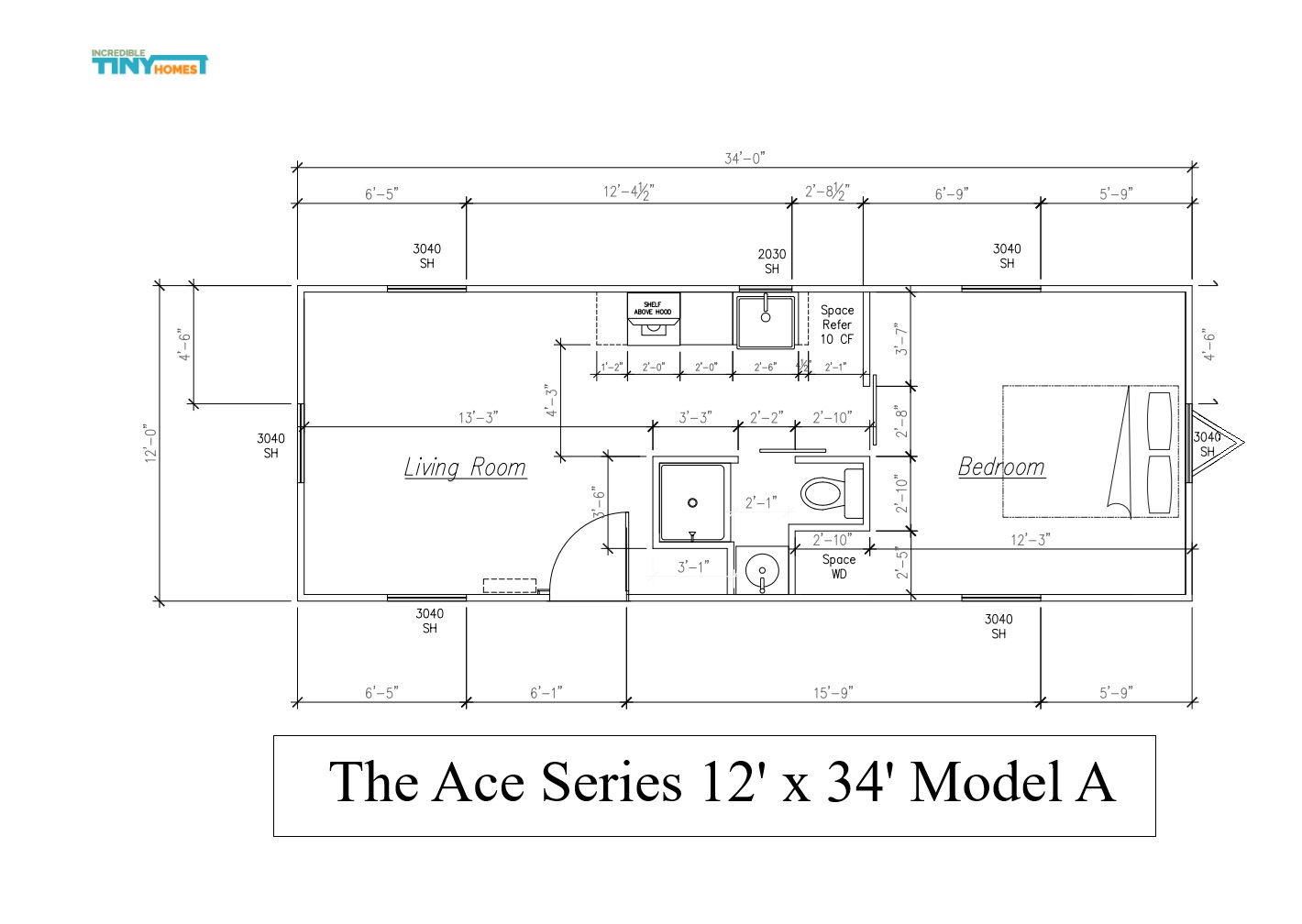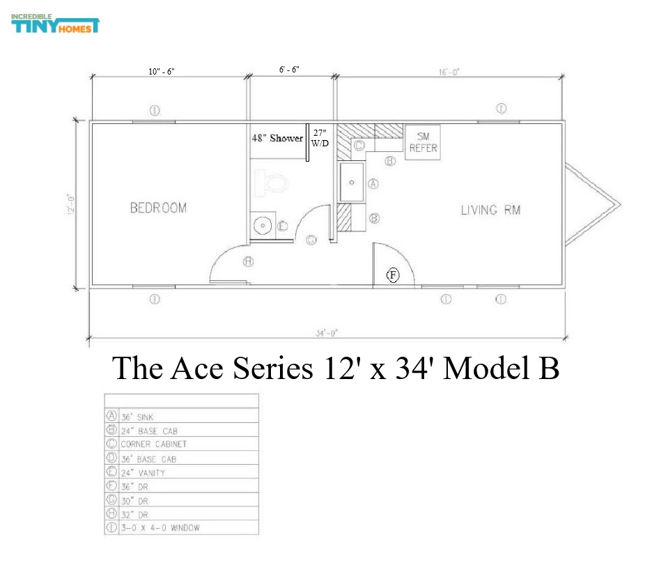 The Ace Series 12′ x 34′ offers a smaller version of the14′ x 40′ model with many of the same amenities, just in a smaller living space. With the same material as the original Incred-I-Box making this home a true DYI dream come true. Offering 408 Sq Ft of living space, allowing you unlimited possibilities.